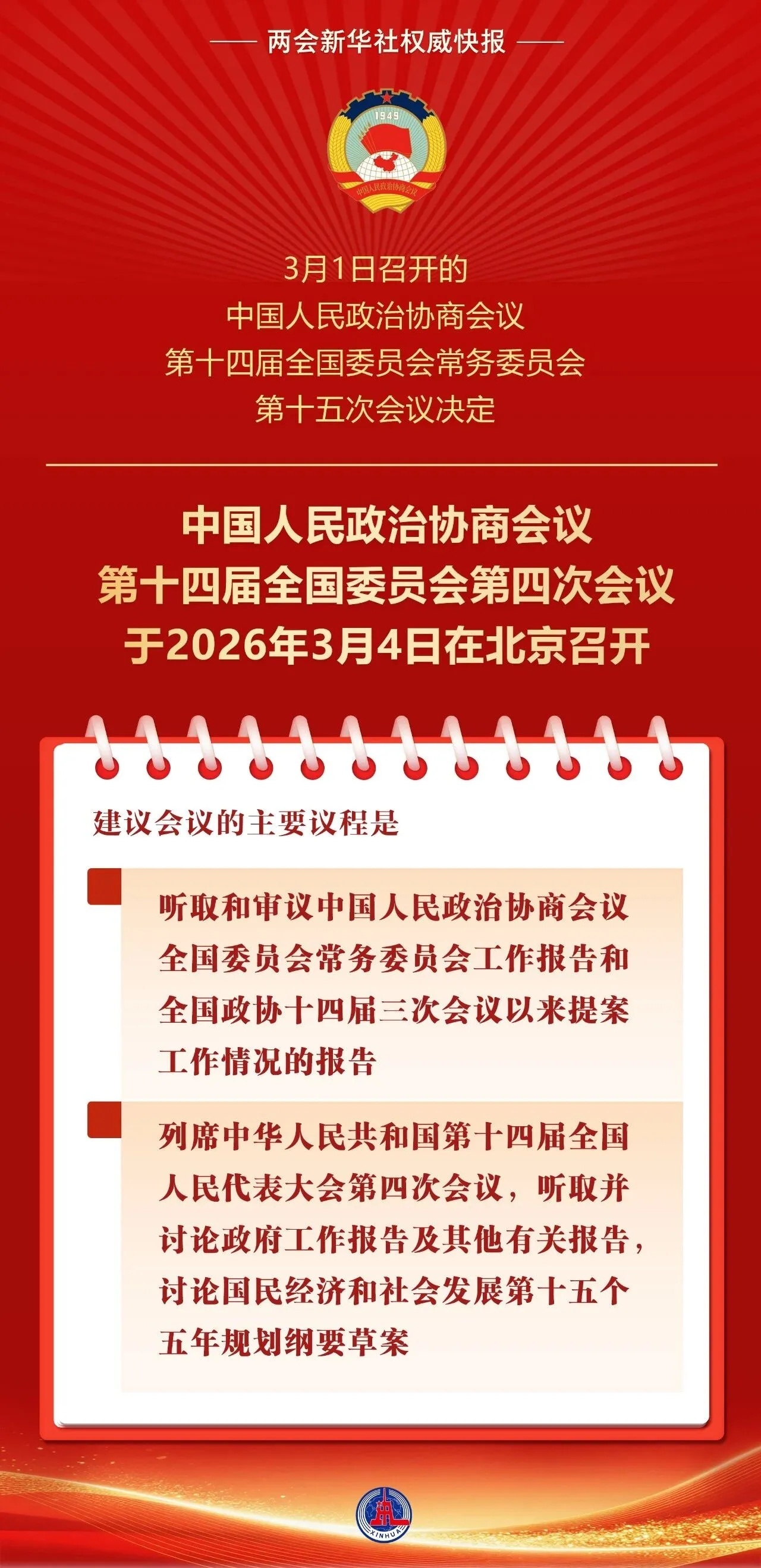 3月1日召开的中国人民政治协商会议第十四届全国委员会常务委员会第十五次会议决定:中国人民政治协商会议第十四届全国委员会第四次会议于2026年3月4日在北京召开。建议会议的主要议程是:听取和审议中国人民政治协商会议全国委员会常务委员会工作报告和全国政协十四届三次会议以来提案工作情况的报告;列席中华人民共和国第十四届全国人民代表大会第四次会议,听取并讨论政府工作报告及其他有关报告,讨论国民经济和社会发展第十五个五年规划纲要草案。