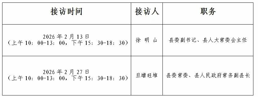 为深入学习贯彻习近平总书记关于加强和改进人民信访工作的重要思想,贯彻落实《信访工作条例》和信访工作法治化,进一步畅通信访渠道,依法及时就地解决群众合理诉求,切实推动领导干部接访工作走深走实,现将洛扎县党政领导接待来访群众有关事宜公告如下:
